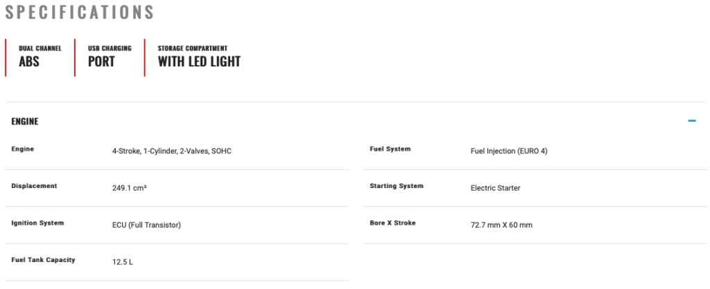 Modenas Elegan EX (2023) is a premium maxi scooter bike powered by Liquid-cooled, 4-stroke SOHC, 250 cc engine with CVT transmission. It produces 22.1 Hp power at 7000 RPM and 22.4 Nm maximum torque at 6500 RPM.​